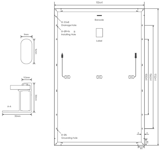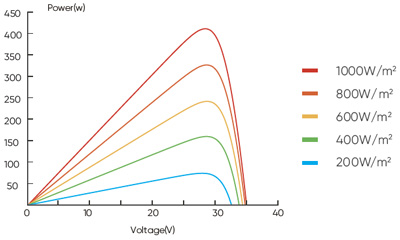 | Bemerkungen 1. Standardtestbedingungen (STC): Sonneneinstrahlung 1000 W/m2; AM 1,5; Zelltemperatur 25°C 2. Nennbetriebsbedingungen (NMOT): Sonneneinstrahlung 800 W/m2; Windgeschwindigkeit 1m/s, Umgebungstemperatur 20°C 3. Maximale Leistungstoleranz: 0~+5 W, Leistungsmessgenauigkeit: ±3 %, Abweichung der Parameter Voc(V), Isc(A), Vm(V) und Im(A): ±3 % |